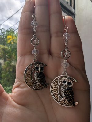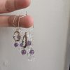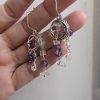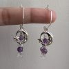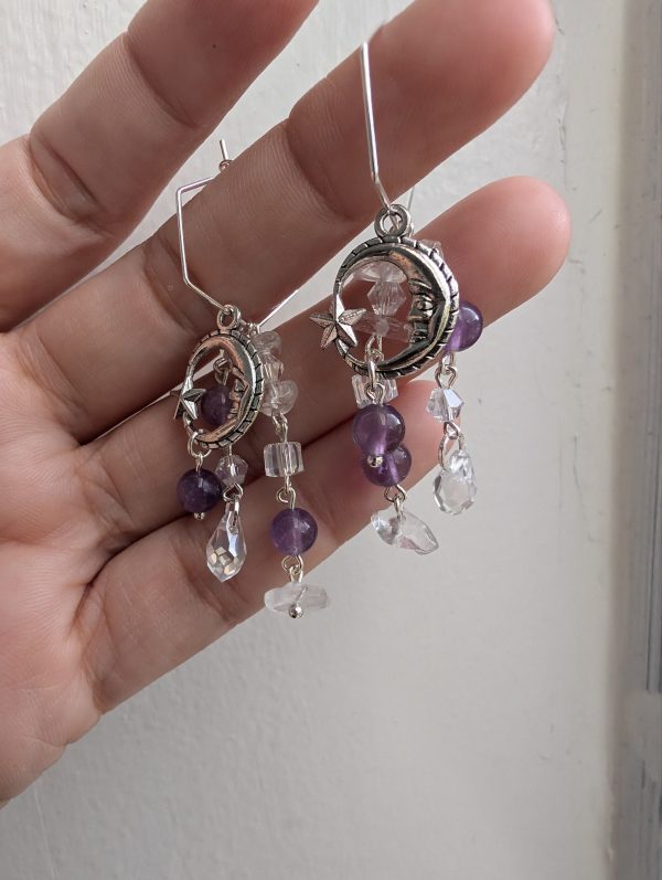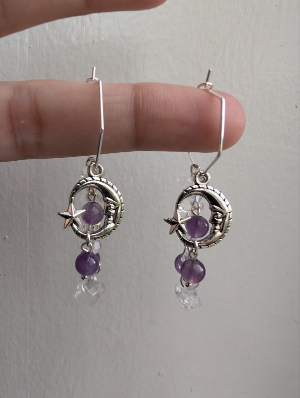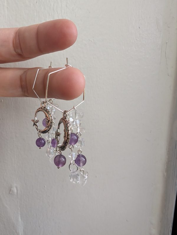 Artemis earrings are made with 925 sterling silver plated octagonal poop earrings, findings, polished stainless steel moon and star charms, natural amethyst crystal beads and a bee treated crystal beads